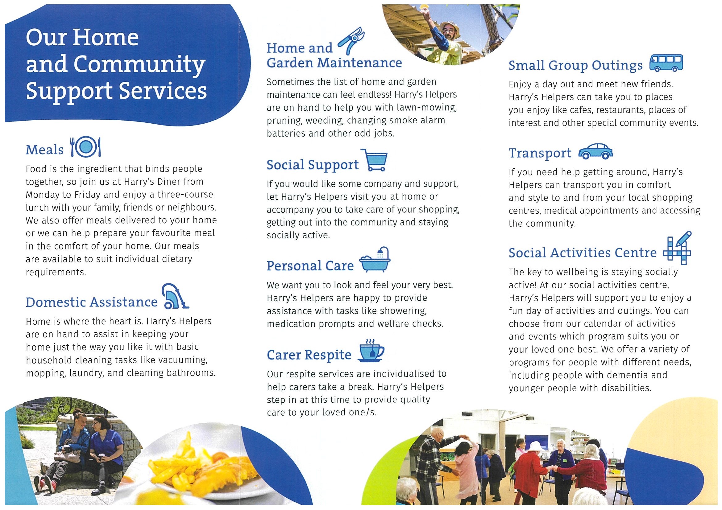 Harold Hawthorne Community Centre (The Centre) has been an integral part of and supporter of the local community since 1968. As a non-for profit organisation, located in Carlisle, The Centre connects people through services, programs, activities and events that enrich their overall wellbeing and provide opportunities for them to become active members of a thriving community. The Centre offers an extensive range of home support services to enable seniors to be socially connected and independent in achieving their goals and remain living independently in their own homes.  We place the service user at the center of all our programs, activities and initiatives. These services include: meals, including Meals on Wheels (fresh meals delivered to the persons home). We also offer take away meals or dine in at the Centre (meals at Centre) personal care domestic assistance carer respite assistance with shopping and bill paying (accompanied shopping)shop by list garden and home maintenance transportsocial support individual social support as part of a groupCentre based day respite social activities centre (group)